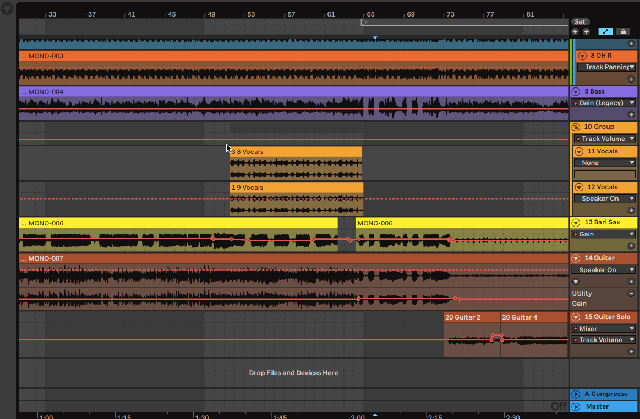 In Live you could always have groups, but now groups can contain sub-groups. This is really handy on a drum bus, where you have your overheads in a group, and then you want a bus for the whole kit. There are plenty of other common situations where this has been very useful for me, for example when grouping a guitar solo comp track group with a rhythm guitar track.